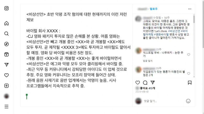비슷한 시기 개봉한 경쟁작들의 홍보 업체가 '비상선언'에 대해 부정적인 입소문을 퍼뜨린 것으로 의심된다는 내용이었습니다.