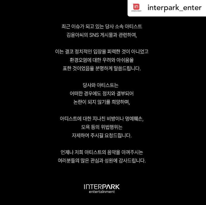 14일 소속사 인터파크 엔터테인먼트는 공식 SNS를 통해 “정치적인 입장을 피력한 것이 아니었다”며 “환경오염에 대한 우려와 아쉬움을 표한 것이었음을 분명하게 말씀드린다”고 밝혔다.