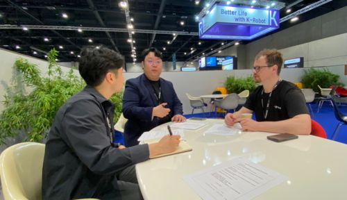 경북창조경제혁신센터 보육기업 마리렌과 독일 스타트업 이페스 관계자가 IFA 전시회에서 만나 업무협의를 하고 있다.
