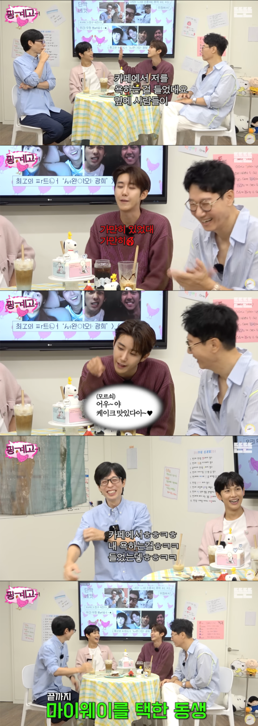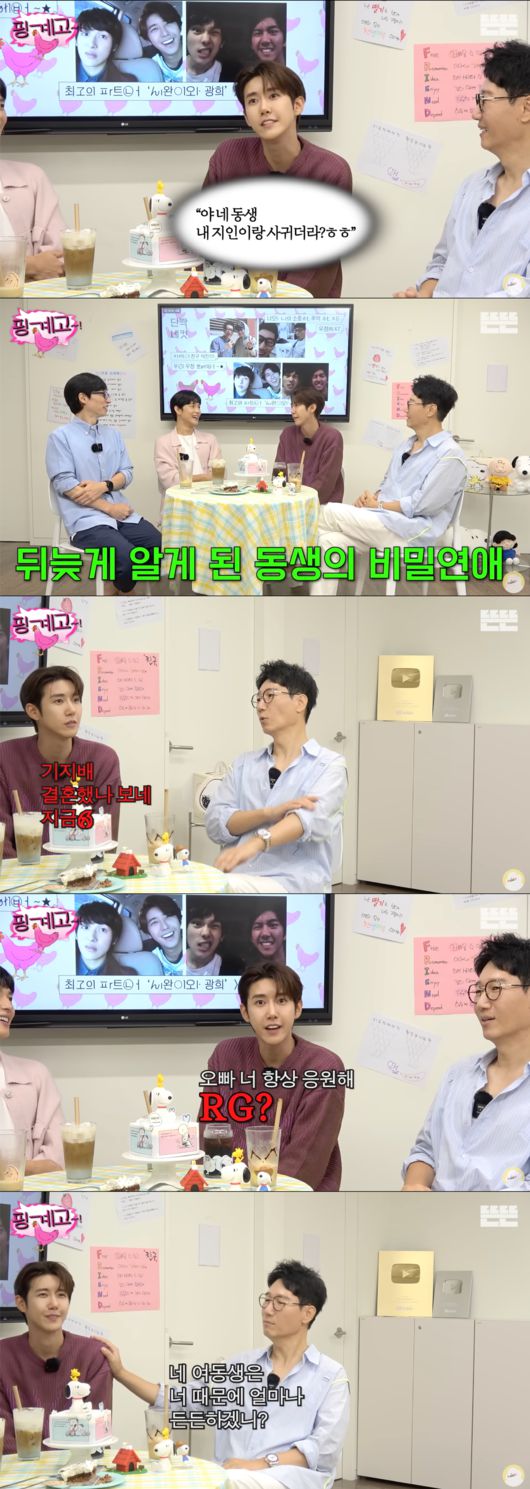 광희는 “기지배 결혼했나 보네”라고 재치있게 넘어가면서 근황을 전했다. 연기를 하던 동생은 최근 작곡을 시작했다고. 그는 여동생에게 “오빠가 너 항상 응원해 알지?”라고 응원을 전했다. 광희 덕분에 여동생이 든든하겠다는 말에 그는 “(동생이) 주변에 제 이야기 안 한다더라. 카페에서 저를 욕하는 걸 들었다. 옆 테이블에서 욕을 하는 걸. 근데 모른 척하고 ‘케이크 맛있다’ 그랬다더라”고 전했다.