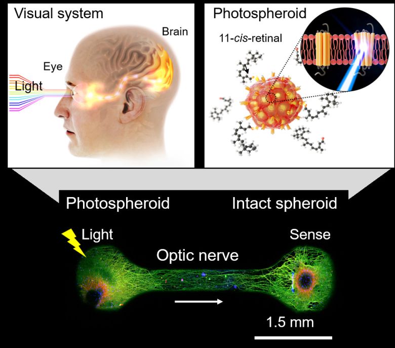 연구진은 명암을 구분하는 로돕신(~490nm)과 색 구분을 위한 청색 옵신(~410nm) 단백질을 발현하여 각각 청색과 녹색에서 선택적인 반응성을 가지는 스페로이드를 제작했다. 연구진이 제작한 스페로이드는 사람의 눈이 인식하는 색과 동일한 파장에서 반응을 일으켰다.