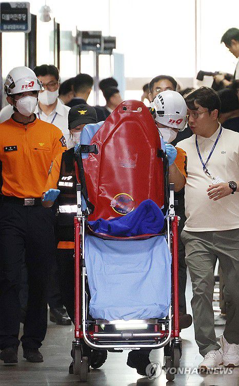 (서울=연합뉴스) 신준희 기자 = 17일 단식 중 건강이 악화된 더불어민주당 이재명 대표를 병원으로 옮기기 위해 투입됐던 구급대원들이 빈 들것을 끌고 당 대표실을 나오고 있다. 2023.9.17