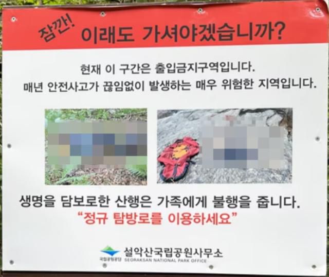 최근 설악산에는 ‘잠깐, 이래도 가셔야 하겠습니까’라는 경고문에 ‘현재 이 구간은 출입 금지 구역’, ‘매년 안전사고가 끊임없이 발생하는 매우 위험한 지역’이라는 문구가 적혀있는 것으로 18일 밝혀졌다.