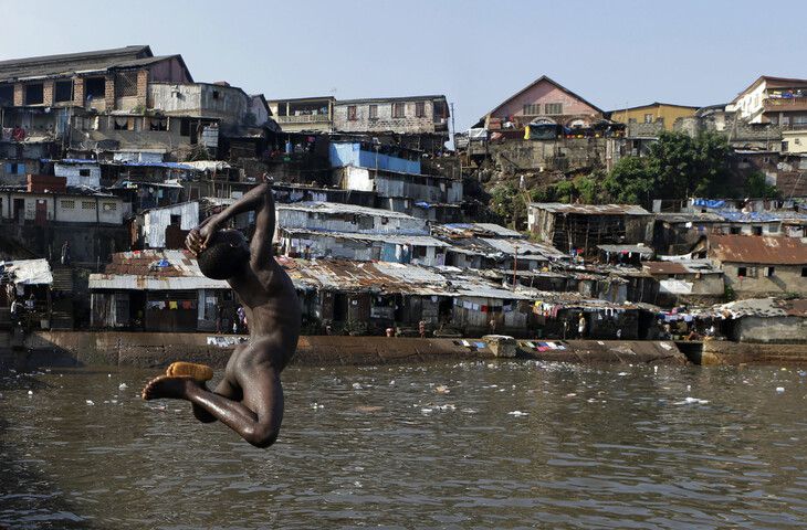 시에라리온 수도 프리타운의 물가에 위태롭게 형성된 빈민가에서 한 소년이 알몸으로 물에 뛰어들고 있다. 프리타운/AP 연합뉴스