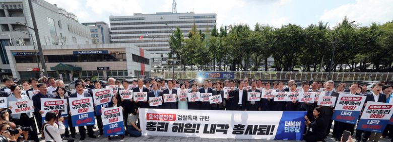 더불어민주당 박광온 원내대표와 의원들이 18일 낮 서울 용산구 대통령실 들머리에서 윤석열 정권 국정 전면 쇄신 및 국무총리 해임, 내각 총사퇴를 촉구하고 있다. 더불어민주당은 이날 오전 한덕수 국무총리에 대한 해임건의안을 국회에 제출했다. 김경호 선임기자 jijae@hani.co.kr