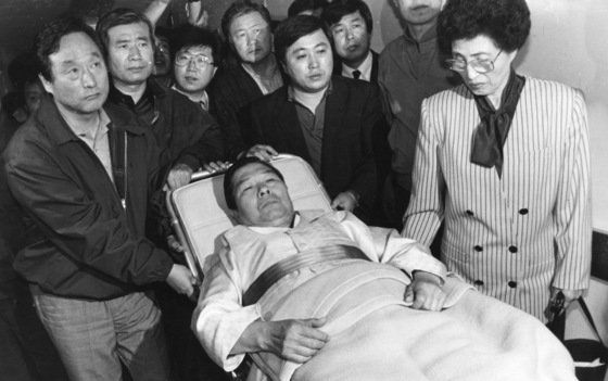 김영삼 전신민당총재가 83년 5월 광주민주화운동 3주년을 맞아 정권에 대한 항의의 표시로 23일간 단식투쟁중 친인들이 문병을 온 모습. 중앙포토 |