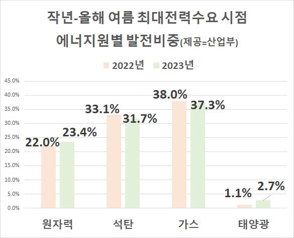 원전은 지난해 여름 최대 전력수요(2022년 7월7일 오후 5시) 시점에서 전국 20기 가동에서 21기 가동으로 늘어나며 기저 전원(電原)의 역할을 톡톡히 했다. 여름 피크 시점에서의 원전 발전량은 20.5GW에서 21.9GW로 1.4GW 늘었고. 전체에서 차지하는 비중도 22.0%에서 23.4%로 1.4%포인트 늘었다.