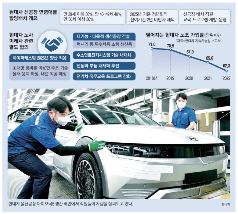 현대차 노조가 연령별 할당제를 이견 없이 수용한 배경에는 기술직 내 세대갈등을 피한다는 명분 외에도 갈수록 줄어드는 노조 가입 비율과 기술직 비중이 꼽힌다. 아직까지 현대차 노조 내 주도권은 울산에서 근무하는 50세 전후 기술직들이 갖고 있지만, 이들 입지는 점점 좁아지고 있다. 하이퍼캐스팅 도입, 다기능·다목적 생산 공장 건설 등 미래 지향적인 계획에 노조가 무작정 반기를 들기 어려운 이유다.