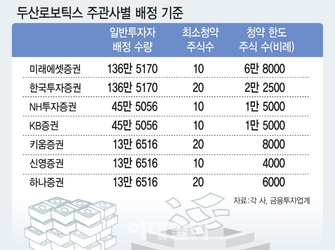 두산로보틱스는 이번 IPO를 통해 1620만주를 발행한다. 이 중 기관과 우리사주가 각각 55%, 20%씩 들고 가고 25%(405만주)를 일반투자자들이 받을 수 있다. 이 405만주도 증권사별로 나뉘는데 공동 대표주관사인 한국투자증권과 미래에셋증권이 일반투자자 몫 배정 수량 136만5170주를 받았다. 공동주관사인 NH투자증권과 KB증권의 몫은 각각 45만5056주다. 인수회사인 키움증권과 신영증권, 하나증권에는 13만6516주가 배정된다.