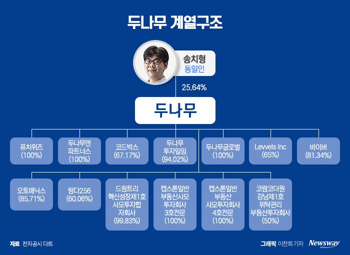 이렇게 늘려간 두나무 자회사는 ▲퓨처위즈(이하 지분율 100%) ▲두나무앤파트너스(100%) ▲코드박스(67.17%) ▲두나무투자일임(94.02%) ▲드림트리혁신성장제1호사모투자합자회사(99.83%) ▲코람코더원강남제1호위탁관리부동산투자회사(50%) ▲바이버(81.34%) ▲오토매닉스(85.71%) ▲람다256(60.06%) ▲두나무글로벌(100%) ▲캡스톤일반부동산사모투자회사3호전문(100%) ▲캡스톤일반부동산사모투자회사4호전문(100%) ▲Levvels Inc.(65%) 등 12곳에 달한다.