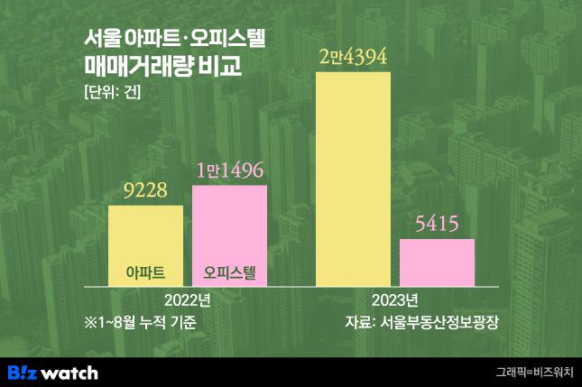 서울부동산정보광장에 따르면 오피스텔 매매거래량은 올해 1~8월 누적 기준 5415건으로 전년 동월(1만1476건)의 반토막 수준이다. 같은 기간 아파트 매매거래량이 9228건에서 2만4394건으로 세 배 가까이 늘어난 것과 비교된다.