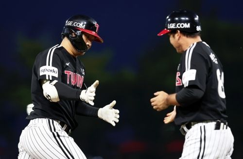 LG 트윈스의 문보경이 19일 광주기아챔피언스필드에서 열린 KIA 타이거즈와의 경기에서 홈런을 치고 3루 코치와 하이파이브하고 있다. 연합뉴스 |