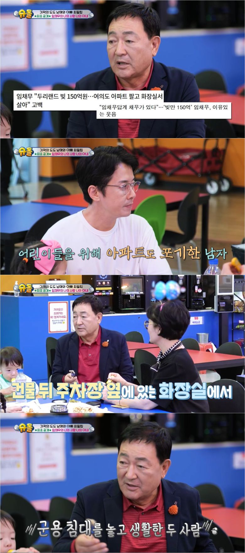 임채무는 "여의도에 집이 두 개나 있었는데 이거 하면서 돈이 없어서 다 팔았어"라고 답했다. 이어 그는 "갈 데가 없어서 집 다 없애고 여기 와서 (살았어). 저기 보면 주차장 화장실 있어. 군용 침대 있잖아, 그거 두개 갖다 놓고 (살았어)"라고 덤덤하게 얘기했다.