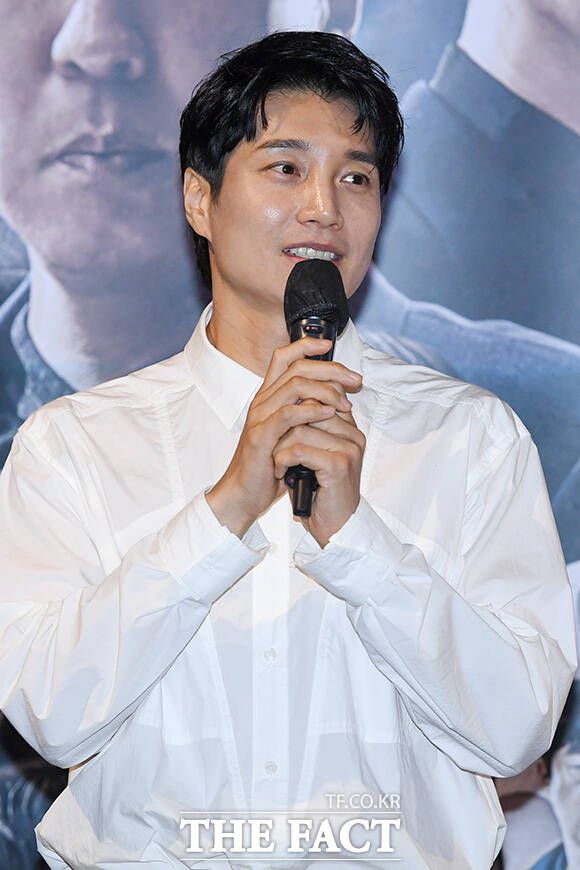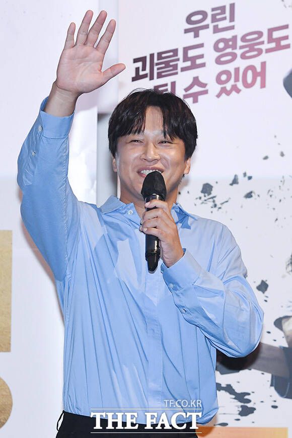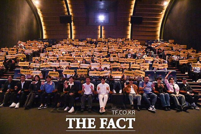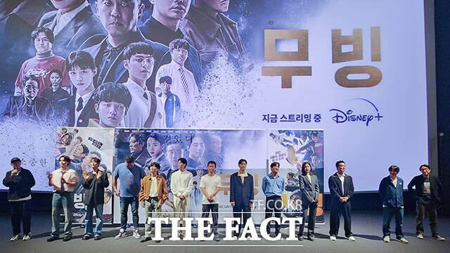 [더팩트ㅣ장윤석 인턴기자] 배우 박병은과 김도훈, 이정하, 박광제, 김중희, 김다현, 유승목, 박희순, 차태현, 한효주, 류승룡 박윤서 감독, 박인제 감독이 20일 오후 서울 용산구 CGV 용산 아이파크몰에서 열린 디즈니+ 오리지널 시리즈 '무빙' 피날레 시사회에 참석해 무대인사를 하고 있다.