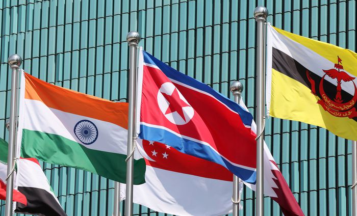 중국 항저우 아시안게임 개막을 4일 앞둔 지난 19일 선수촌 내 국기광장에 북한 인공기를 비롯한 참가국들 국기가 걸려있다. 연합뉴스