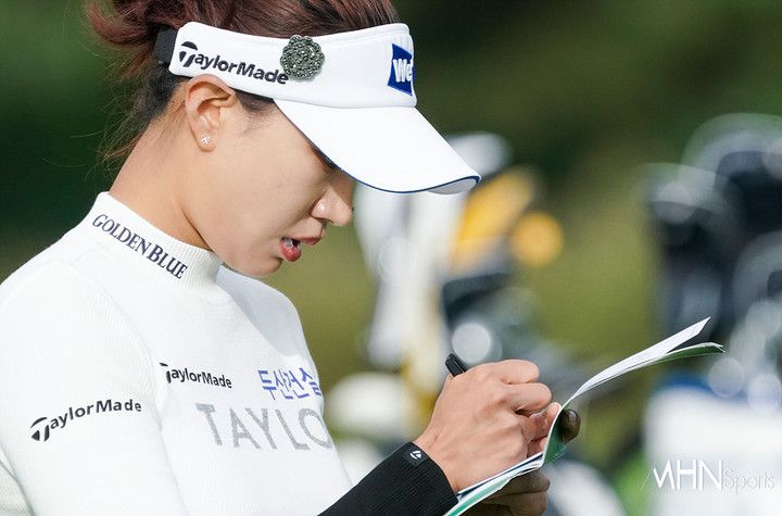 이날 유현주(29, 두산건설)가 파를 기록한 후 스코어 카드를 적고 있다.