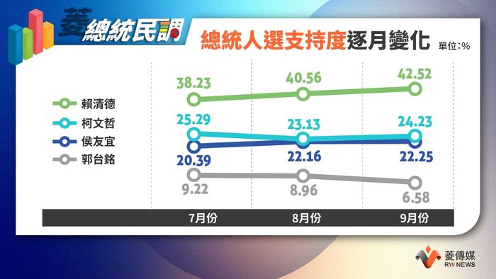 궈 후보는 국민당 경선에서 탈락한 후 무소속 출마를 선언했지만 선거전에서 별다른 존재감을 드러내지 못하고 있다. 궈 후보는 공식 출마를 선언하기 이전인 지난 7월에 RW뉴스가 진행한 조사에서 9.22%의 지지율을 나타냈지만, 이번 달 조사에서는 오히려 지지율이 하락했다. 그의 출마로 다른 야권 후보들에 대한 지지세가 분산될 것으로 예상됐지만 전반적으로 선거 판세에 미치는 영향은 미미한 상태다. 커 후보와 허우 후보 지지율 변화는 궈 후보 출마 선언 전과 비교해 1%포인트 안팎에서 움직이고 있으며, 지난달과 비교하면 두 후보 모두 지지율이 소폭 상승했다.