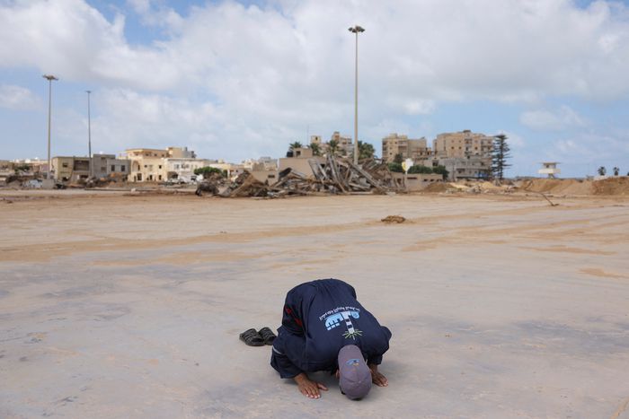 열대성 폭풍 ‘대니얼’이 휩쓴 리비아 데르나에서 20일(현지시간) 한 주민이 폐허가 된 도시를 배경으로 기도하고 있다. 로이터연합뉴스