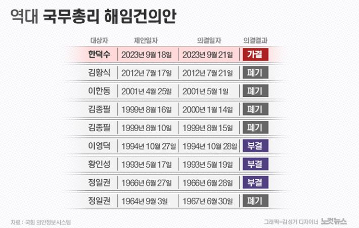 국무총리 해임건의안이 국회를 통과한 것은 이번이 처음이다. 지금껏 총 9번의 총리 해임건의안이 발의됐지만 모두 기한 만료로 폐기됐거나 의결정족수 미달로 부결됐다.