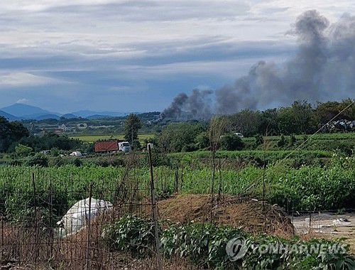 (서산=연합뉴스) 21일 임무 수행을 위해 이륙하던 KF-16 전투기 1대가 추락한 충남 서산 공군 제20전투비행단 기지 내에서 검은 연기가 피어오르고 있다. 조종사 1명은 비상 탈출해 무사한 상태이며, 추락 지점이 기지 내여서 민간 피해는 없는 것으로 전해졌다. 2023.9.21 [독자 제공. 재판매 및 DB 금지]