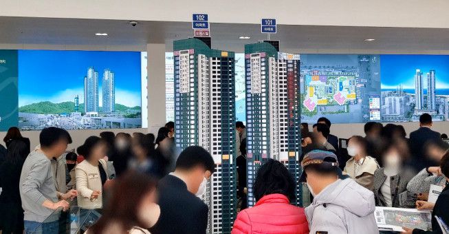 한 아파트 견본주택에서 방문객들이 내부 구조와 인테리어를 살펴보고 있다. |