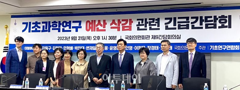 21일 더불어민주당 과방위ㆍ교육위 소속 국회의원이 공동 주최ㆍ기초연구연합회가 주관으로 국회 의원회관에서 열린 ‘기초과학연구 예산삭감 관련 긴급간담회’에는 조승래 더불어민주당 과방위 간사와 정옥상 기초연구연합회 회장, 천승현 세종대학교 교수, 오경수 중앙대학교 교수, 최은영 서울대학교 교수 등이 참석했다.