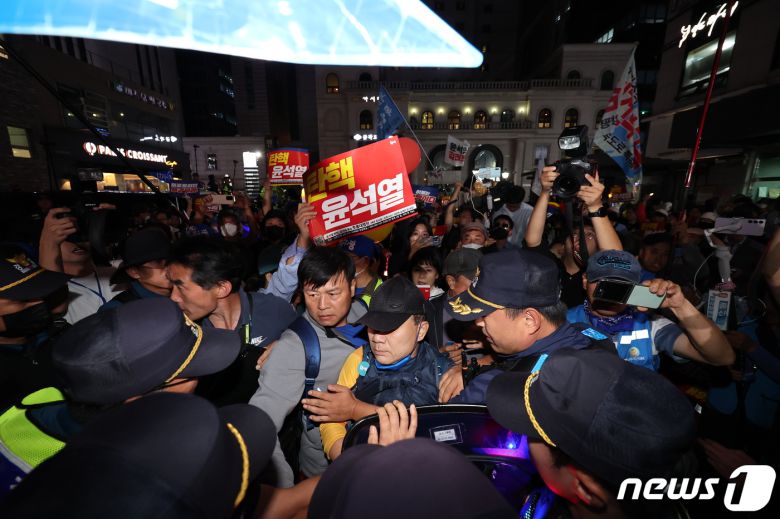 (서울=뉴스1) 김진환 기자 = 이재명 더불어민주당 대표 체포동의안이 가결된 21일 오후 촛불행동 회원과 이재명 대표 지지자들이 서울 여의도 국민의힘 중앙당사에서 더불어민주당 당사로 향하던 중 경찰과 충돌하고 있다. 2023.9.21/뉴스1kwangshinQQ@news1.krCopyright ⓒ 뉴스1. All rights reserved. 무단 전재 및 재배포, AI학습 이용 금지.이 기사의 카테고리는 언론사의 분류를 따릅니다.0공유하기