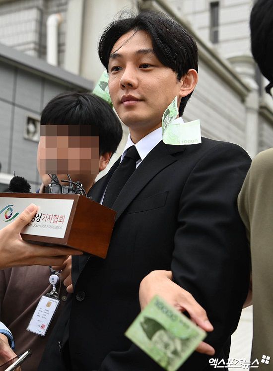 유아인이 약 두 시간의 심문을 마치고 호송차로 향하던 중 한 시민이 던진 돈다발을 맞았다.
