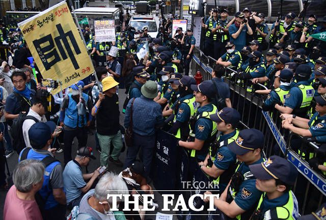 이재명 더불어민주당 대표의 체포동의안이 21일 오후 국회 본회의에서 가결되자, 이른 시간부터 국회 앞에 모인 이 대표 지지자들이 분노했다. 이날 오후 민주당 당사 앞에서 분노한 일부 지지자들과 경찰이 대치하고 있다. /이새롬 기자