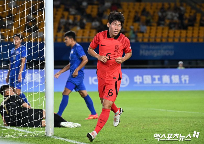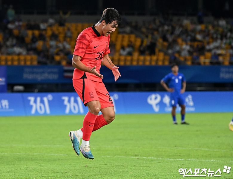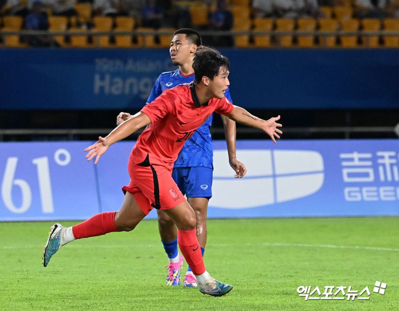 그러던 한국은 전반 15분 유럽파 홍현석이 첫 골을 넣으며 태국을 무너트리기 시작했다. 레프트백 설영우의 크로스를 홍현석이 태국 선수들 헤집고 골지역 정면에서 헤더 슛으로 연결해 첫 골을 폭발한 것이다.
