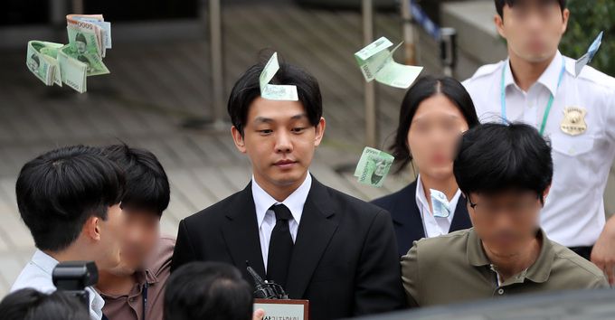 배우 유아인(본명 엄홍식)이 21일 서울 서초구 서울중앙지법에서 열린 마약류 관리에 관한 법률 위반 등 혐의 구속 전 피의자 심문(영장실질심사)을 마친 후 대기 장소로 이동하는 중 한 시민이 "영치금으로 쓰라"며 돈을 뿌리고 있다. 뉴시스 |