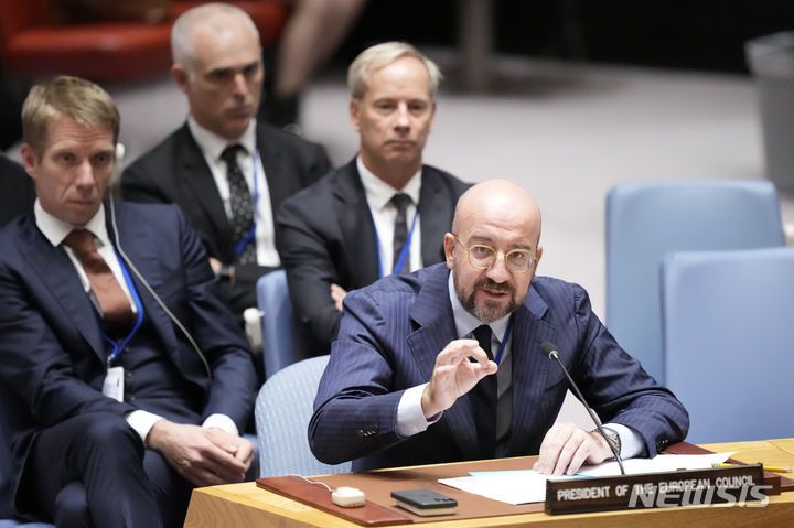 [서울=뉴시스] 김예진 기자 = 샤를 미셸 유럽연합(EU) 정상회의 상임의장은 유엔 안전보장이사회(안보리)에서 중국을 지목해 러시아의 종전 설득에 나서라고 촉구했다.