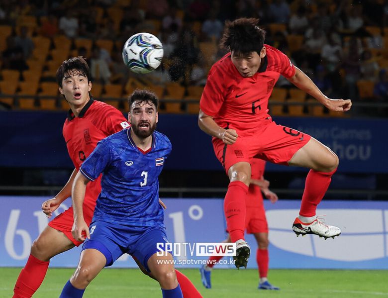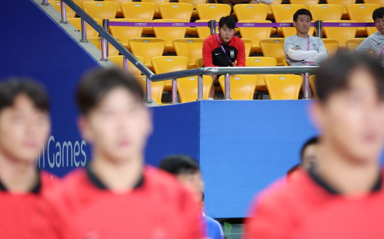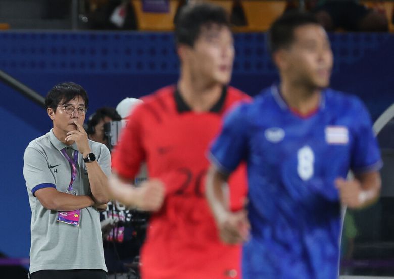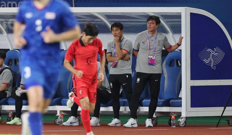 21일 중국 항저우 진화 스포츠센터 경기장에서 열린 2022 항저우 아시안게임 남자축구 조별리그 E조 2차전 태국과 경기가 끝나고 기자회견에서 후반전 경기력을 질책했다.