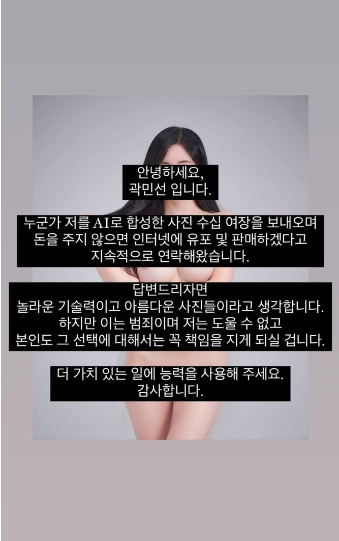 21일 곽민선 아나운서는 자신의 인스타그램 스토리에 사진 한 장과 함께 글을 올렸다. 곽민선 아나운서는 "누군가 저를 AI로 합성한 사진 수십 여장을 보내오며 돈을 주지 않으면 인터넷에 유포 및 판매하겠다고 지속적으로 연락해 왔다"라고 밝혔다.