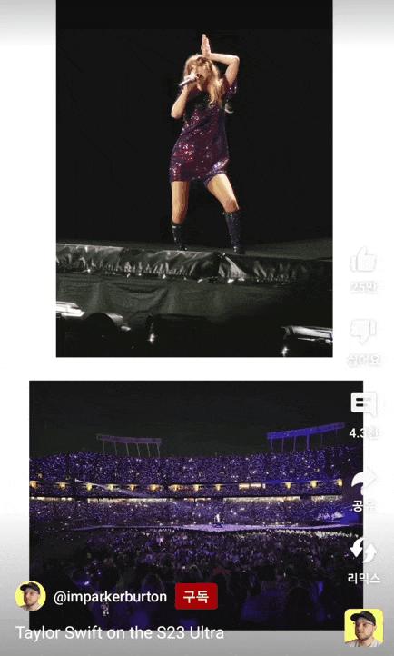 유튜버 imparkerburton는 자신의 '갤럭시S23 울트라'를 가지고 테일러 스위프트 공연을 보러 간 아내가 자신의 '아이폰'보다 카메라 성능이 더 좋다고 전했다고 밝혔다. [영상=유튜버 imparkerburton 캡처] |