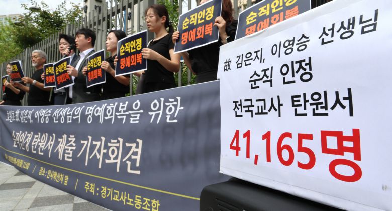 경기교사노동조합 관계자들이 지난 4일 오전 세종시 정부세종2청사 인사혁신처 앞에서 호원초 고 김은지·이영승 선생님의 명예회복을 위한 순직인정 전국 교사 탄원서 제출에 앞서 기자회견을 하고 있다. 연합뉴스 |