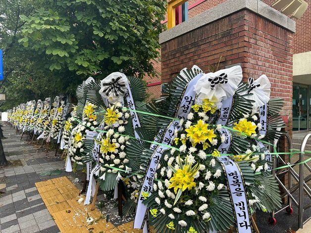 지난 8월 10일 오후 경기 의정부시 호원초등학교 일대에 조화가 줄지어 늘어선 모습. 전국 각지에서 젊은 두 교사의 죽음에 대한 진상규명을 촉구하는 문구를 써서 보냈다. 뉴스1 |