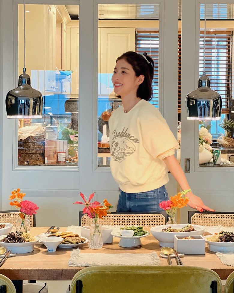 공개된 사진 속 기은세는 자신이 차린 여러 음식들 속에서 미모를 뽐내고 있다.