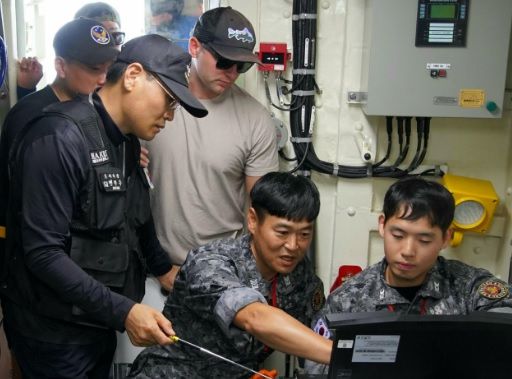 한·미 공동 수중조사팀이 소나(SONAR)에서 탐지된 데이터를 분석 및 토의하고 있다. /사진제공=국방부 |