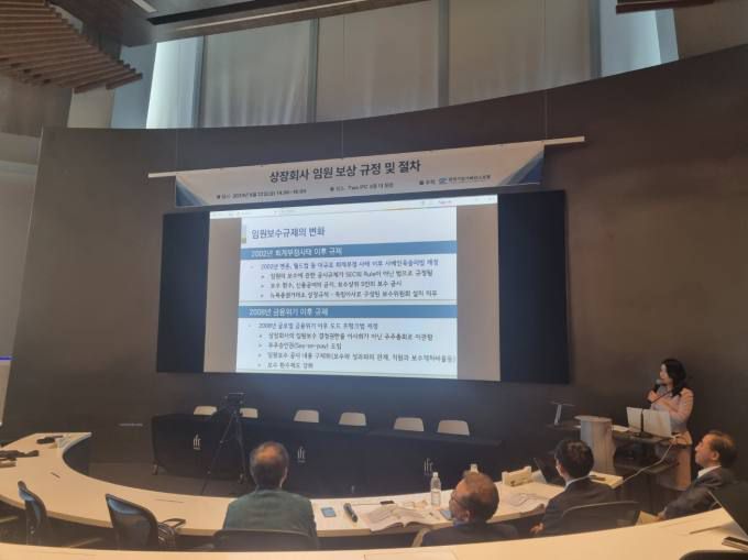 이 교수의 발표 이후 심혜섭 남양유업 감사가 각각 주주권리 행사를 통한 임원 보수 통제에 대해 법적 내용과 판례를 들어 설명했다. 뒤를 이어 황현영 자본시장연구원 연구위원이 미국 임원보수 규제 연혁, 현행법상 미국 임원보수 규제 중 주주의 승인권(say-on-pay) 등에 대한 발제를 진행했다.