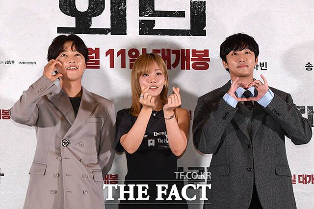 배우 송중기와 김형서, 홍사빈(왼쪽부터)이 22일 오후 서울 강남구 메가박스 코엑스에서 열린 영화 '화란' 언론시사회 및 기자간담회에 참석해 포즈를 취하고 있다. /서예원 인턴기자 |