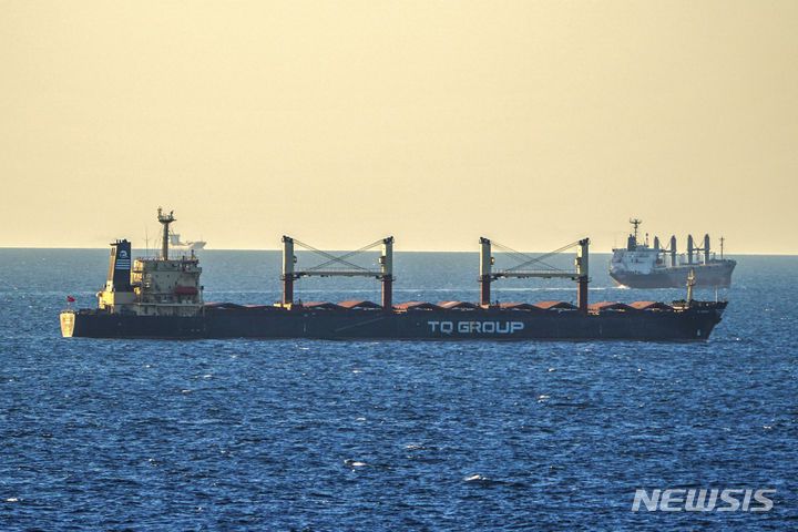 [이스탄불=AP/뉴시스] 7월17일 러시아의 일방 탈퇴 직전 흑해항을 출발한 우크라 곡물수출 화물선이 보스포러스해협에 들어와 이스탄불로 향하고 있다. 2023.07.18.