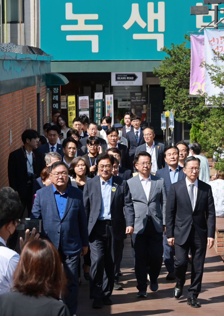 22일 오전 이재명 더불어민주당 대표가 병상 단식을 이어가는 가운데 서울 중랑구 녹색병원에서 이 대표와 면담을 마친 민주당 의원들이 밖으로 나서고 있다. [연합]