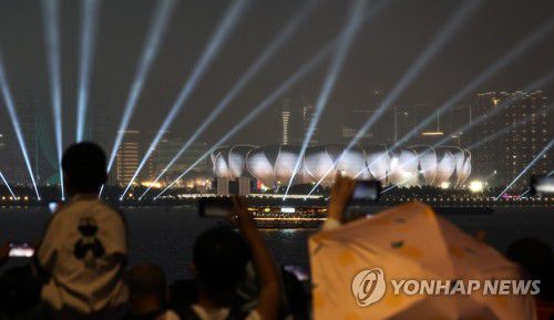 (항저우=연합뉴스) 이지은 기자 = 2022 항저우 아시안게임 개막을 하루 앞둔 22일 오후 중국 항저우 올림픽 스포츠센터 스타디움과 시내 주변이 불을 밝히고 있다. 2023.9.22