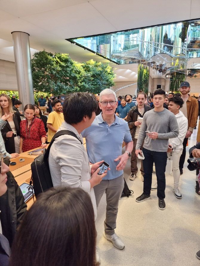 이날 오전8시 그레그 조스윅 애플 글로벌마케팅 수석 부사장과 애플스토어 입구에 나온 그는 일일이 아이폰15를 사러온 사용자들과 만나 환영하고 기념촬영을 했다. 한쪽 문이 잠겨있어 직접 문을 열고 나오는 해프닝을 보이기도 했다. 전날 저녁부터 밤을 지새웠던 1호 대기자는 아이폰 15를 빨리 더 보는 게 중요해서인지 쿡 CEO와 가볍기 악수만 하고 들어가 쿡 CEO를 당황시키기도 했다. 다른 대기자 대부분은 팀쿡과 기념촬영을 한 뒤 직원들의 환영을 받고 입장했다.