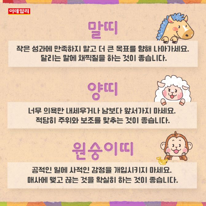 75년생 - 새로운 일이나 변화는 피해야 하는 시기입니다. 한 눈 팔지 말고 현재 자신의 일에 집중하세요.