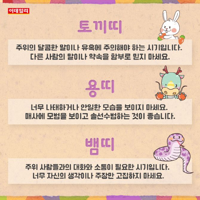 주위의 달콤한 말이나 유혹에 주의해야 하는 시기입니다. 다른 사람의 말이나 약속을 함부로 믿지 마세요.