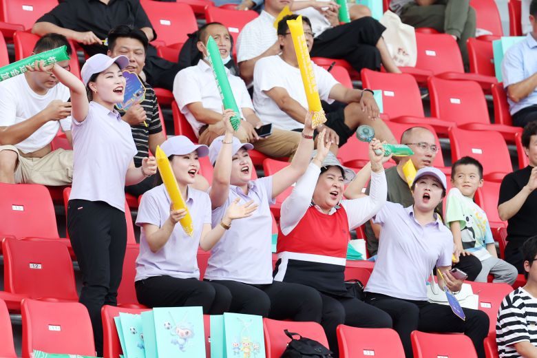 2022 항저우 아시안게임 남자 축구 F조 북한과 대만의 1차전이 열린 지난 19일 중국 저장성 진화의 저장성사범대동쪽경기장. 이날 연보라색 피케 티셔츠와 모자를 맞춰 입은 북한 여성 응원단 4명이 경기장을 찾아 선수단을 응원했다.