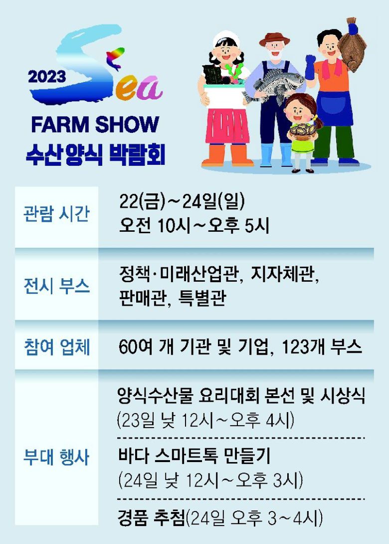 박람회는 24일까지 오전 10시부터 오후 5시까지 열리며 참가비는 없다. 매일 선착순 100명에게 5000원 할인권을 준다. 23일엔 양식수산물 요리대회 본선과 시상식이, 24일엔 퀴즈쇼와 바다 스마트폰 그립톡 만들기 행사가 각각 열린다.