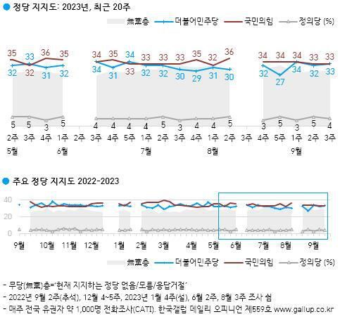 한국갤럽은 "주간 단위로 보면 진폭이 커 보일 수도 있으나, 양당 격차나 추세는 통계적으로 우열을 가릴 수 없는 오차범위(최대 6%포인트) 내에서의 변동"이라며 "3주 전 범위를 살짝(1%포인트) 벗어나기도 했지만, 이내 되돌아왔다"고 분석했다.